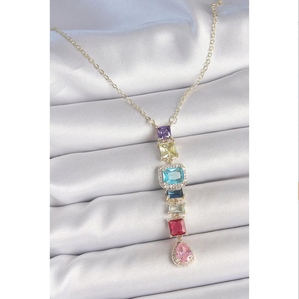 Gold Karışık Renk Zirkon Taşlı Y Pirinç Kolye