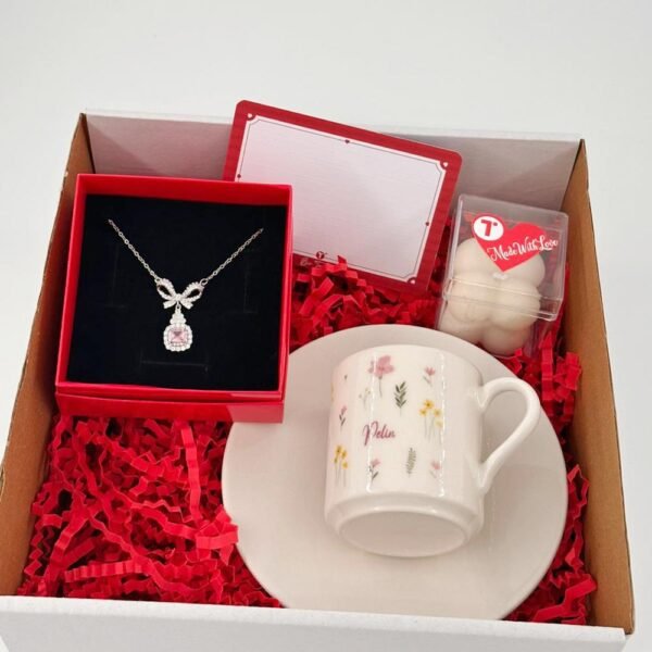 En özel anlarınıza anlam katacak, sevginizi en samimi şekilde ifade etmenizi sağlayacak bu kişiye özel hediye kutusuyla tanışın! İçinde özenle seçilmiş, fiyonk temasını yansıtan çelik kolye ve tamamen size özel hale getirilebilen ürünlerle dolu bu kutu, sevdiklerinizin kalbinde unutulmaz bir yer edinecek. Kutu İçeriği: İsimli Türk Kahvesi Fincan, Çelik Kolye,Mum Hediye Not'u 20x20x10cm boyutunda hediye kutusunda gönderilir. SEÇTİĞİNİZ İSİM, HARF VE HEDİYE NOTUNUZU SİPARİŞ AÇIKLAMA KISMINA EKLEYEBİLİRSİNİZ.